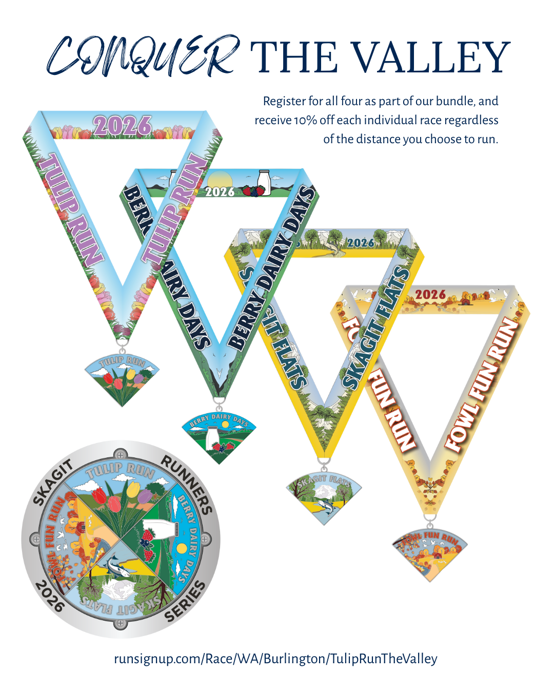 In 2026, Skagit Runners invites the community to Conquer the Valley – a year-long running series that celebrates consistency, commitment, and the beautiful Skagit Valley. Runners who register for all four signature events – Tulip Run, Berry Dairy Days, Skagit Flats, and Fowl Fun Run – through the Conquer the Valley bundle will receive 10% off every race, regardless of distance. More importantly, those who complete any distance at each event will earn an exclusive 2026 medal holder designed to showcase all four finisher medals in one cohesive display. The series is about more than miles or medals – it’s about running the Valley together across the seasons, and celebrating those who commit early and embrace the full journey with us from spring through fall.
